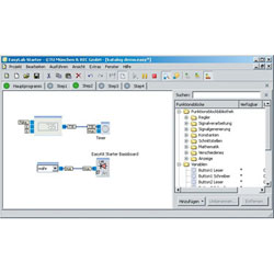 EasyLab offers both of these options. The main program is a sequencer which allows branches and parallel sequences in addition to a linear sequence. Each step is assigned a data flow program as a subroutine. Programs are put together using functional modules with a high abstraction level. This means that the range of modules which can address the input and output channels of the microcontroller goes beyond functional modules alone, going from timers, counters, arithmetic and logical functions right up to entire controllers.